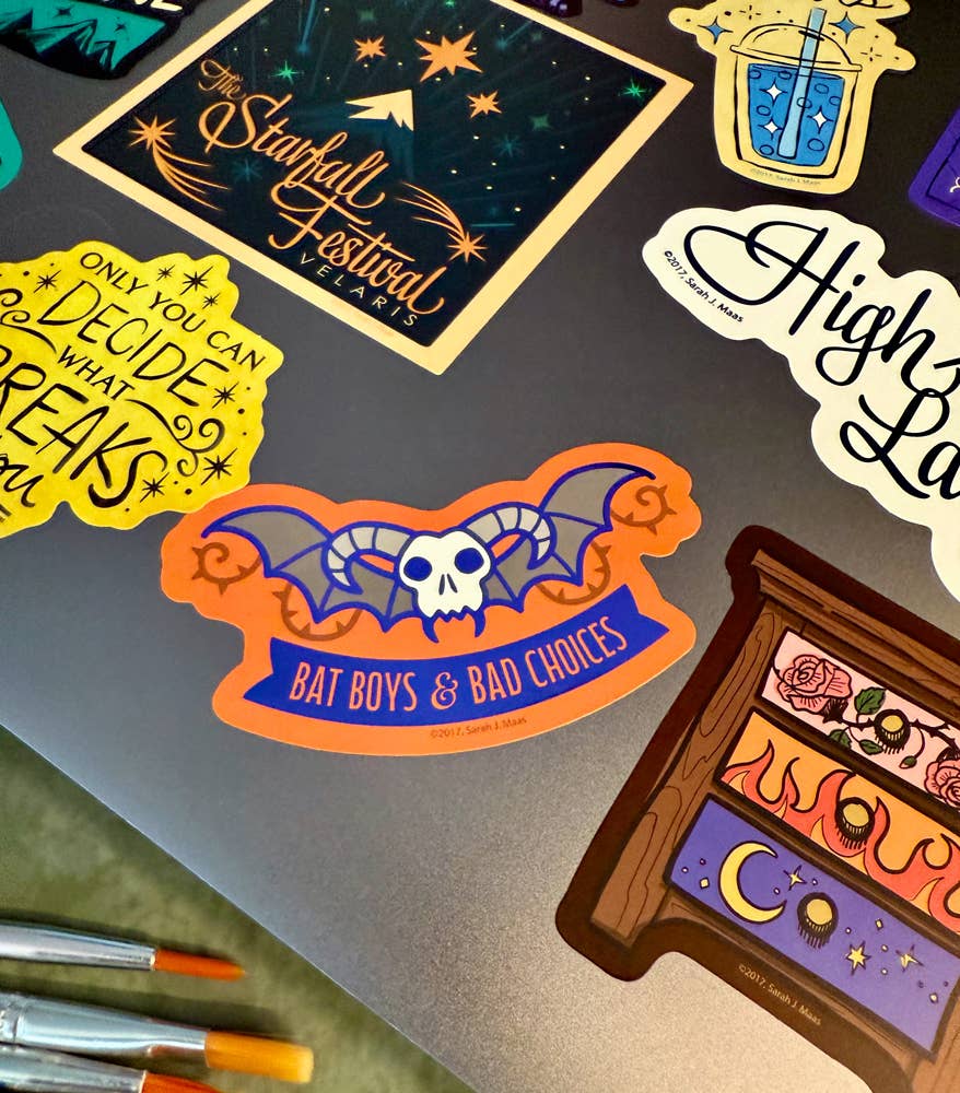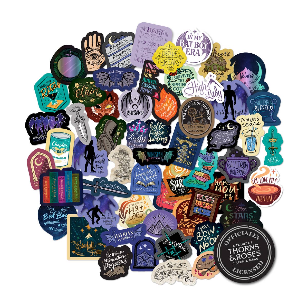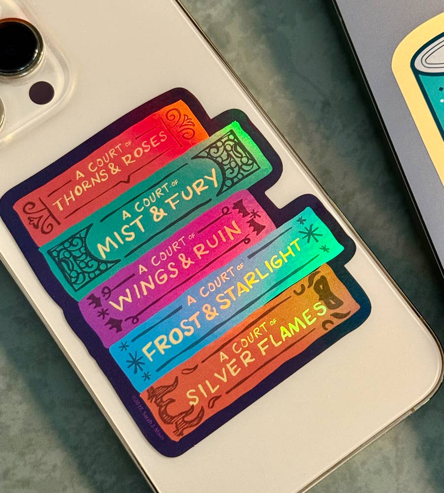 Bring the heat of the Night Court everywhere you go with this set of 60 Officially Licensed A Court of Thorns and Roses decals, including 5 holographic and 5 foil designs. From "To the stars who listen..." to "Hello, Feyre darling" and The Bat Boys, these stickers serve up the quotes that broke us, healed us, and made us blush.