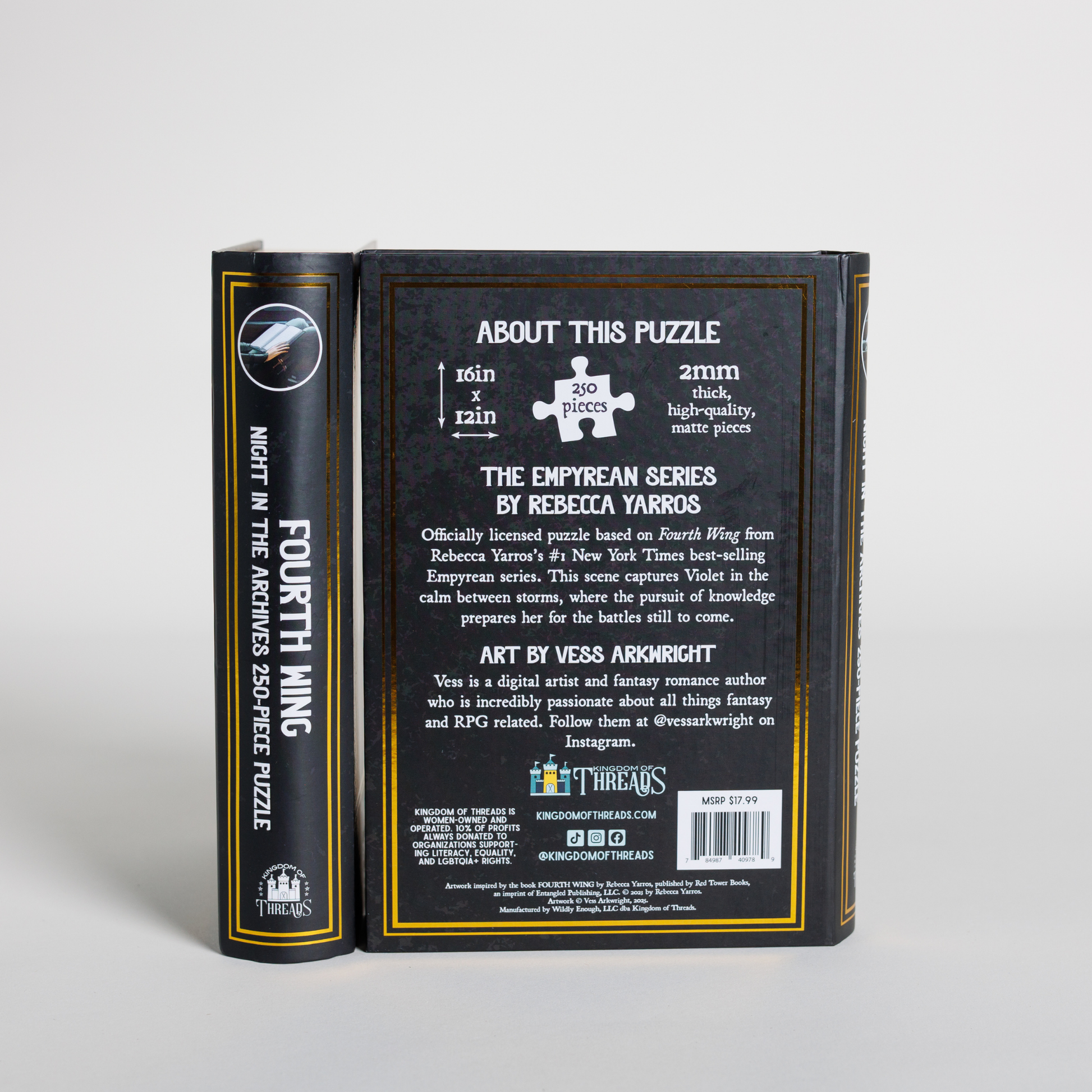 “I am a scholar. There’s nowhere as calming as the archives…” -Fourth Wing by Rebecca Yarros Take a breath with Violet Sorrengail in the calm between storms as she prepares for the battles still to come. Your customers will love doing this puzzle while dreaming of dragons! This officially licensed Fourth Wing puzzle comes in a book-shaped keepsake box complete with sprayed edges, beautiful interior art, and a magnetic closure. This is a must-have for every collector. The perfect gift for the reader who has everything. Art by Vess Arkwright Vess is a digital artist and fantasy romance author who is incredibly passionate about all things fantasy and RPG related. Find them online as aetherixart.