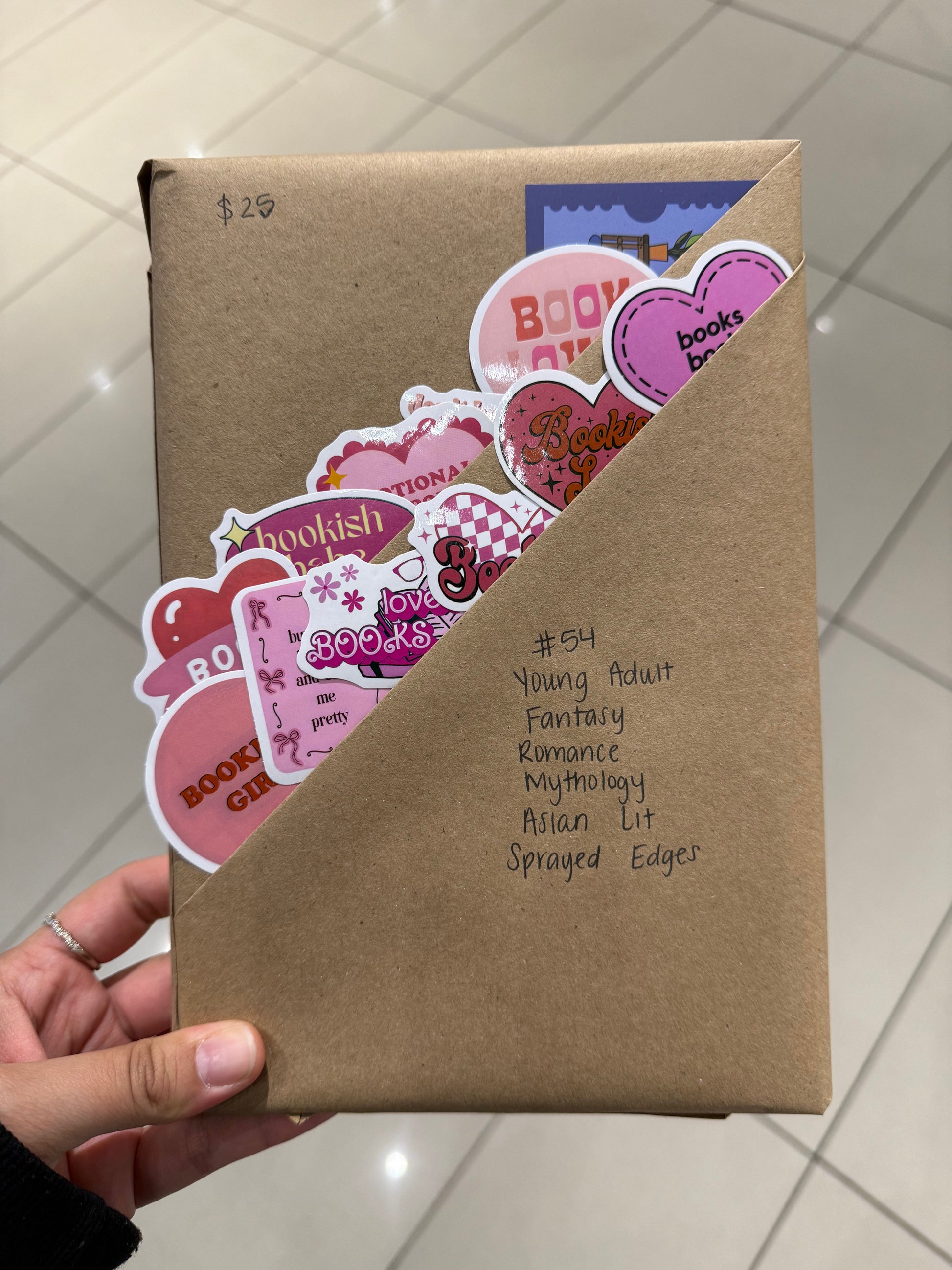 The color of paper used to wrap your book and any extra decorations we add to the wrapping like washi tape and ribbon are always random and subject to what we have on hand to use.