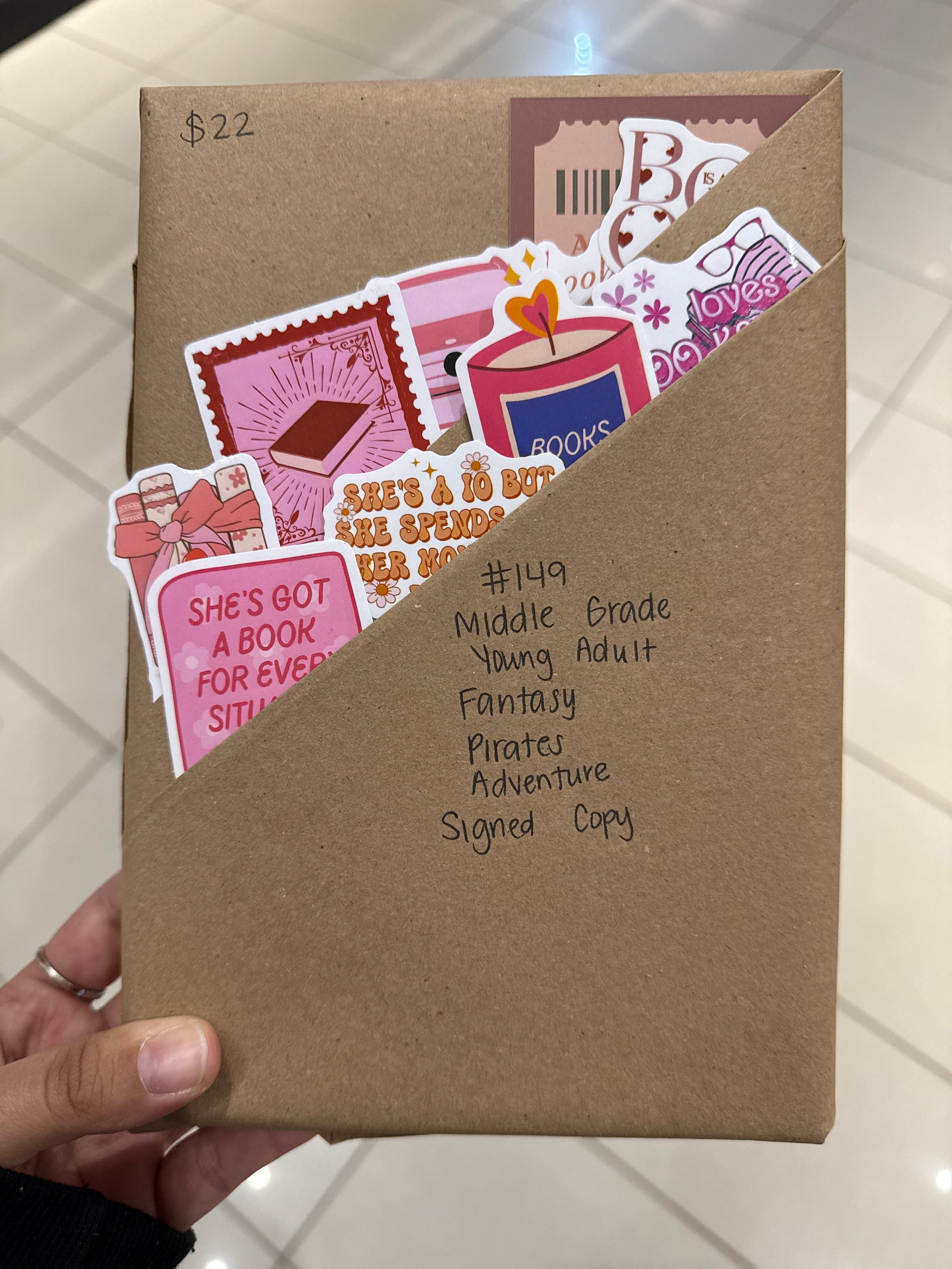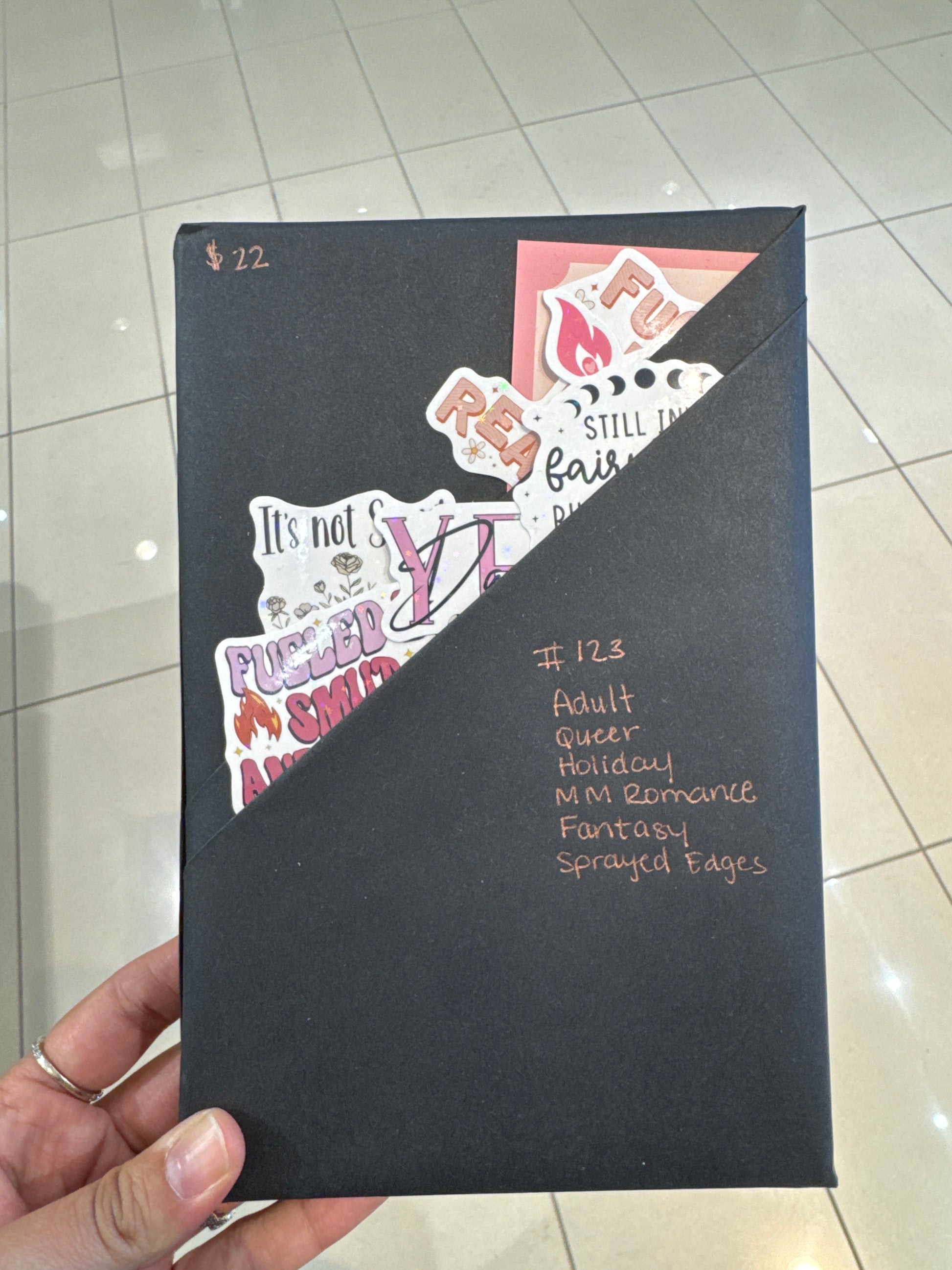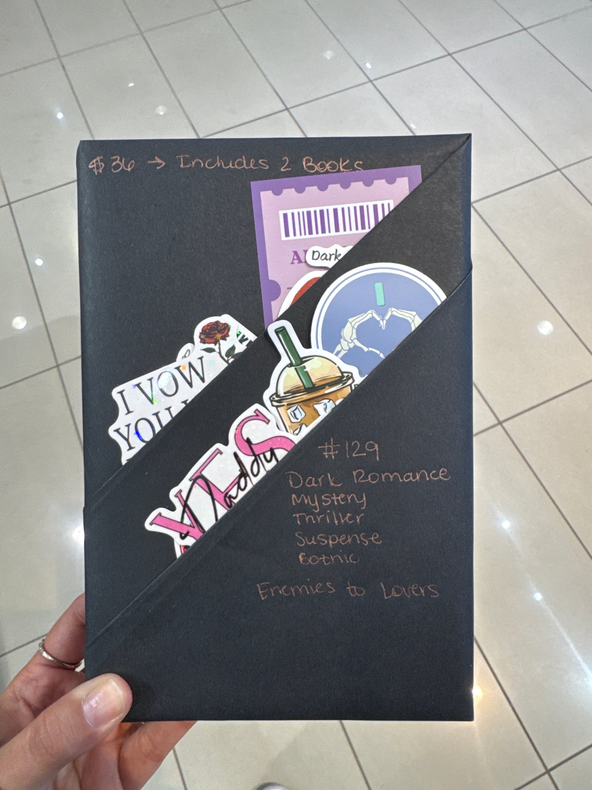 The color of paper used to wrap your book and any extra decorations we add to the wrapping like washi tape and ribbon are always random and subject to what we have on hand to use.